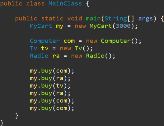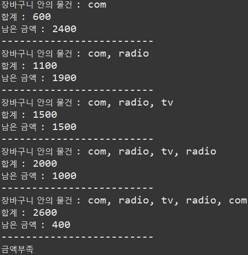 - buy() 는 모든 상품을 받도록 선언 , 가진돈과 제품의 가격을 비교해, 부족하면 금액부족 출력 후 종료