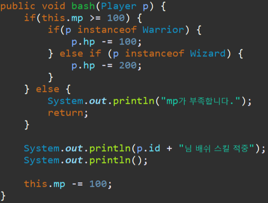 2. 매개변수로 받은 객체가 Warrior 인지 Wizard 인지 확인한다