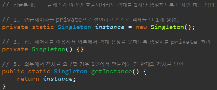 싱글톤은 객체가 1개만 존재하는 패턴 입니다