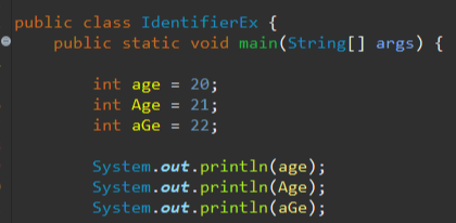 4. 키워드(예약어)는 사용불가 ex) int class; int byte;