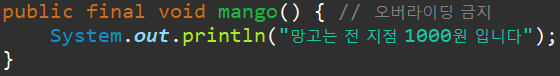 메서드 앞에 final 이 붙으면 ? 오버라이딩 금지.