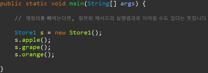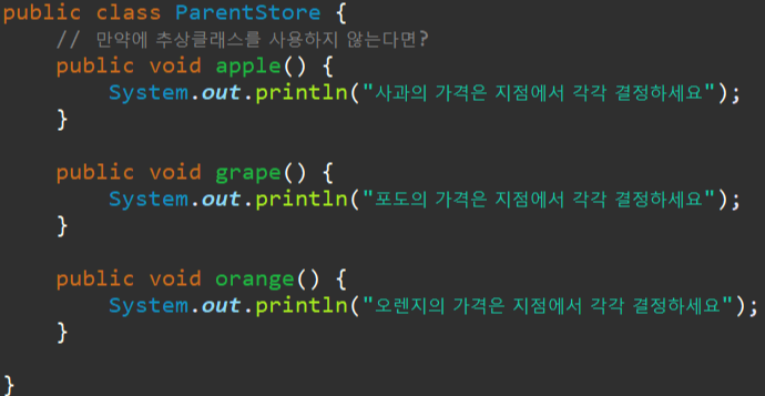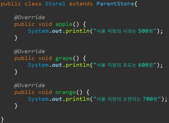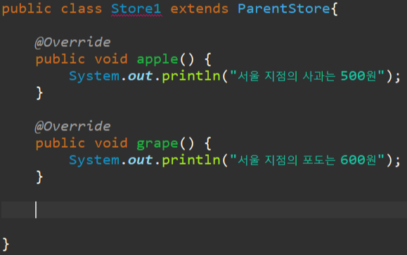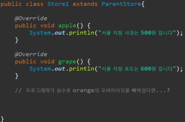 부모 클래스 ParentStore 앞에 abstract 를 붙여주고, 무조건 오버라이딩 해야할 메서드 앞에 abstract 를 사용해 줍니다.