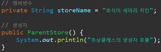 이렇게, 추상화된 클래스 안에서 다른 멤버변수, 생성자, 일반메서드 를 사용할 수 있습니다.