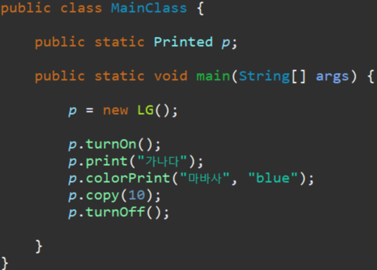 main 에서 interface 의 기능들을 사용했고, interface 에서 오버라이딩 된 메서드가 실행이 되었다.