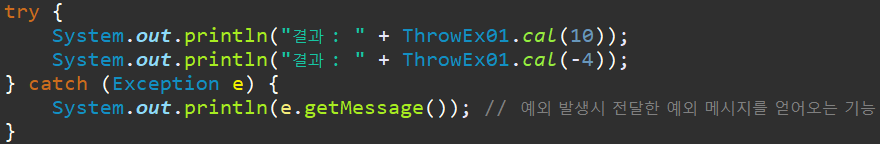 getMessage() 는 예외를 만들 때 넘겨주었던 문자열을 반환 가져와서 반환 해줍니다.