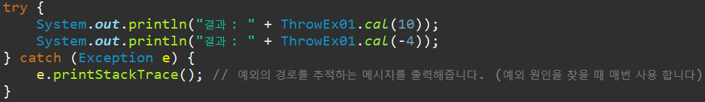 printStackTeace() 는 예외를 만들 때 넘겨주었던 문자열을 출력하면서, 같이 에러가 어디서 발견 되었는지 경로를 출력해 줍니다.