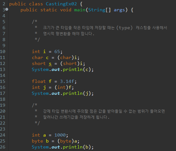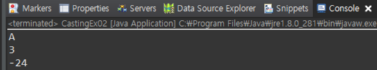 이 경우에 결과값이 -24 임을 확인 할 수 있습니다. 이처럼 데이터가 손실 되어 예상할 수 없는 데이터(쓰레기값)가 될 수 있기 때문에, 명시적 형변환을 해주어야 합니다. ( 명시를 하면서 한번 더 확인을 해보라는게 아닐까 싶습니다 )
