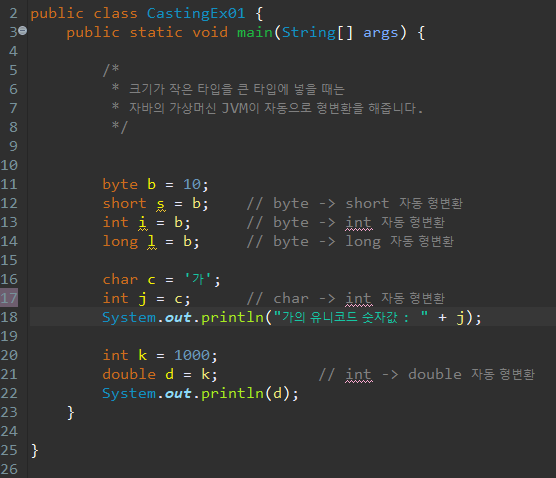 자동 형변환 이란 말 그대로 자동적으로 형 변환 되는 건데, 보통 작은 크기의 데이터 유형에서 큰 데이터 유형으로 형 변환이 이루어 집니다.