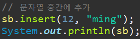 - insert(int offset, String str) -> 문자열 충간에 추가