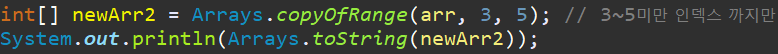 - copyOfRange(int[] original, int from, int to) -> from부터 to 미만까지 original배열 복사