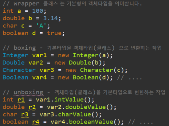 기본타입들 byte char short int long float double boolean 이런 것들을 객체로 만들어 주는 겁니다.
