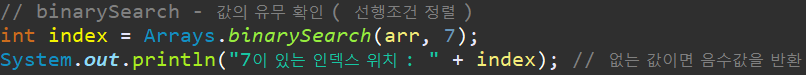 - binarySearch(int[] a, int key) -> 배열의 값중에 key 값이 있으면 해당 index 반환