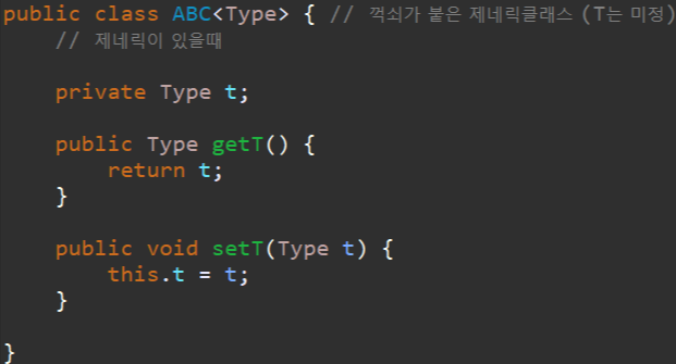 제네릭은 클래스 또는 인터페이스 뒤에 <>(꺽쇠) 가 오는 것을 의미합니다
