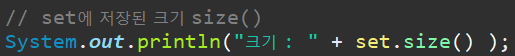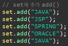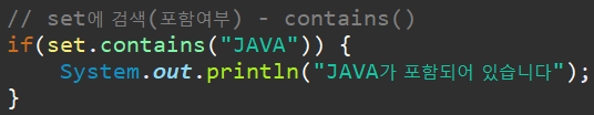 - contains(Object o) -> set에 o가 포함되어 있는지 여부 true, false