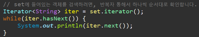 set에 접근할 때에는 , Iterator(반복자) 를 만들어서 접근을 해야 합니다.