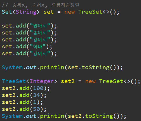 중복된 강아지는 저장이 안된걸 확인 할 수 있고, 저장된 값은 순서에 상관없이 오름차순으로 정렬되어 있는 것을 확인 할 수 있습니다.