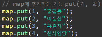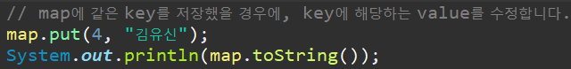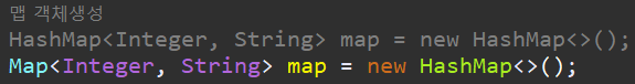 Map은 Key, Value 를 가지고 있기 때문에 위 사진처럼, Key값에 사용할 타입과 Value값으로 사용할 타입을 지정해주어야 합니다 <Interger, String>