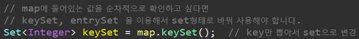 - keySet() -> key만 추출해서 Set형태로 반환