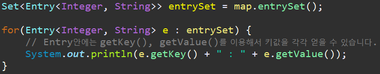 EntrySet은 key를 얻어올 수도, value를 얻어올 수도 있습니다.