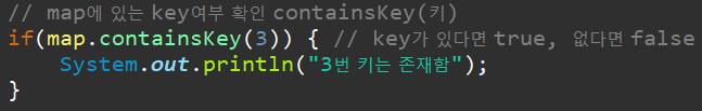 - containsKey(Type key) -> map 안에 매개변수로 받은 key값이 있는지 검사합니다